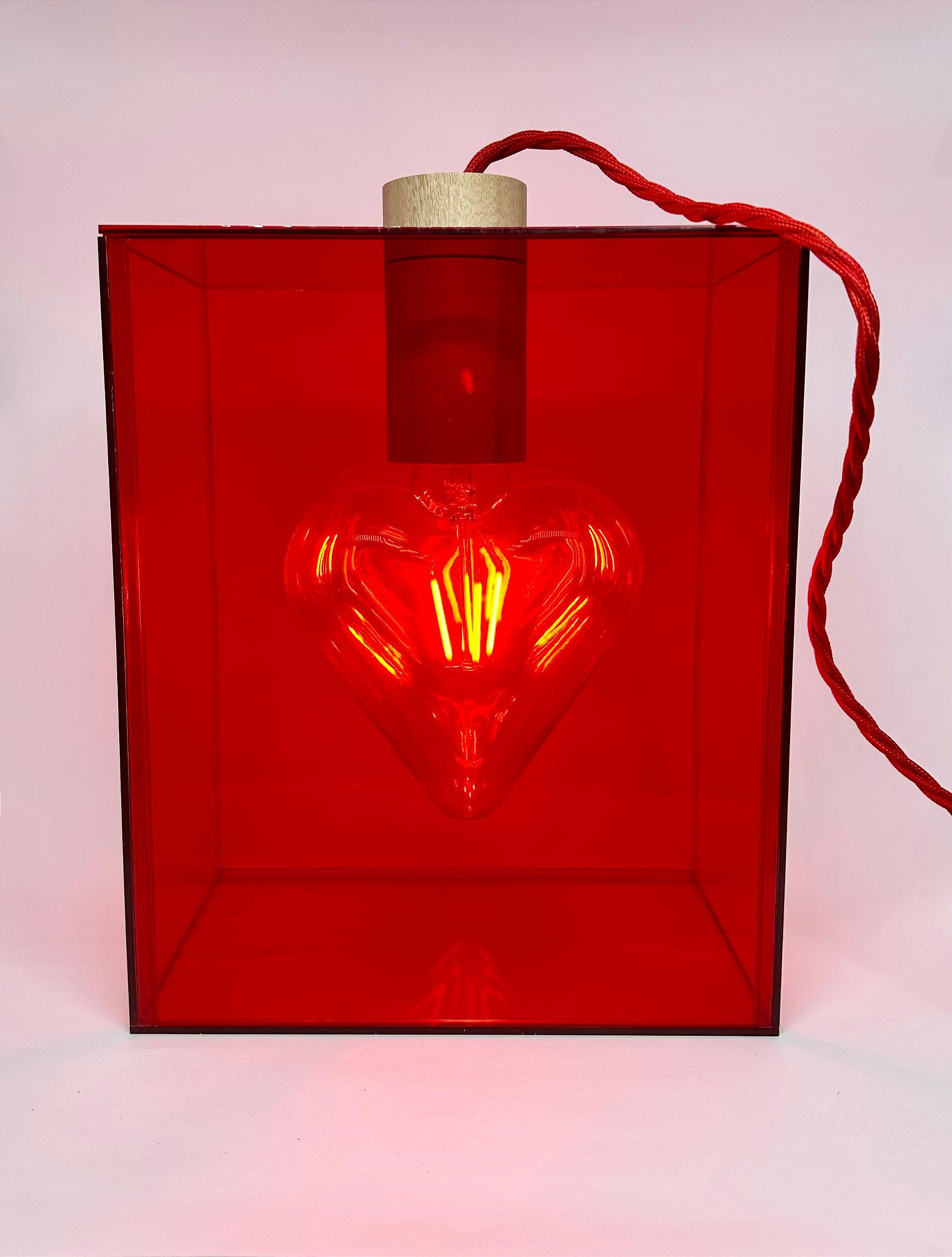 Luminária de parede ou mesa com lâmpada coração em filamento de led, bivolt, dentro de uma caixa de acrílico, bocal em madeira, fio vermelho com 2 metros
