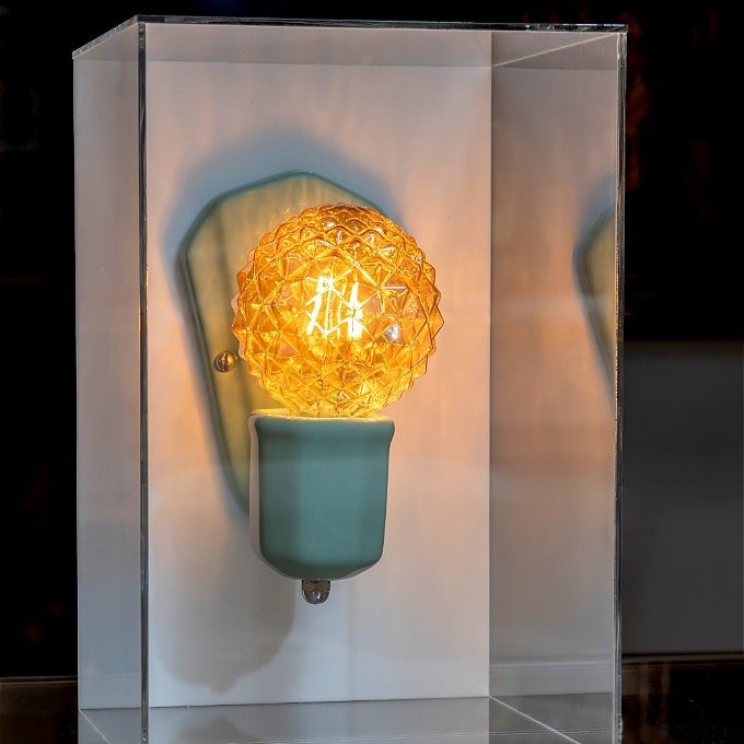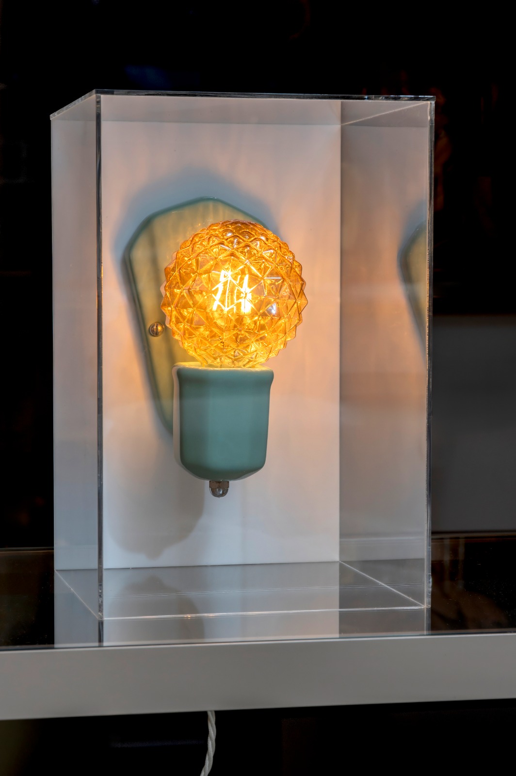 Luminára de mesa em acrílico com fundo leitoso branco, laterais e tampa transaprentes.