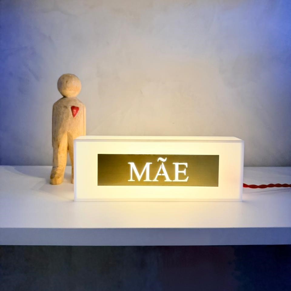 Luminária de parede ou mesa com lâmpada de led, bivolt, dentro de uma caixa de acrílico, com placa de latão com a palavra mãe escrita, fio com 1,80 metros
