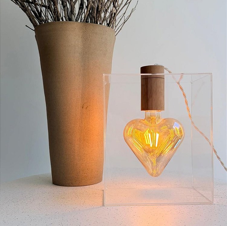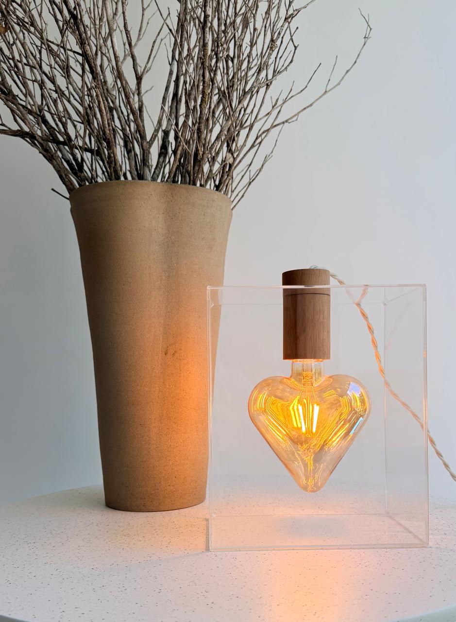 Luminária de parede ou mesa com lâmpada coração em filamento de led, bivolt, dentro de uma caixa de acrílico, bocal em madeira, fio bege com 2 metros