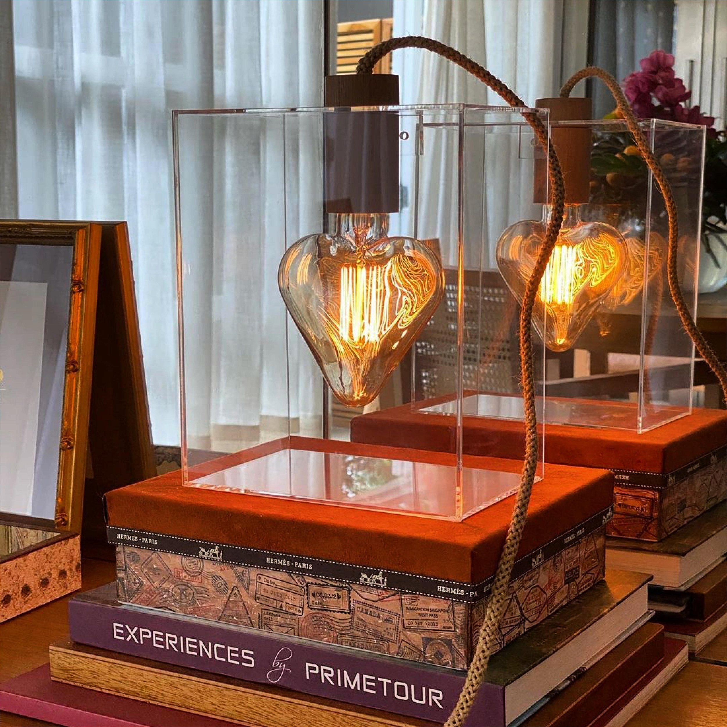 Luminária de parede ou mesa com lâmpada coração em filamento de led, bivolt, dentro de uma caixa de acrílico, bocal em madeira, fio corda com 2 metros