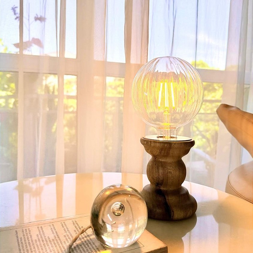 Luminária de mesa, a base em madeira maciça Freij[o e acabamento latão, com lâmpada em filamento de led, bivolt. Com 1,80 de fio útil trançado na cor bege.