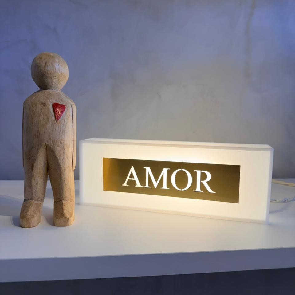 Luminária de parede ou mesa com lâmpada de led, bivolt, dentro de uma caixa de acrílico, com placa de latão com a palavra amor escrita, fio com 1,80 metros