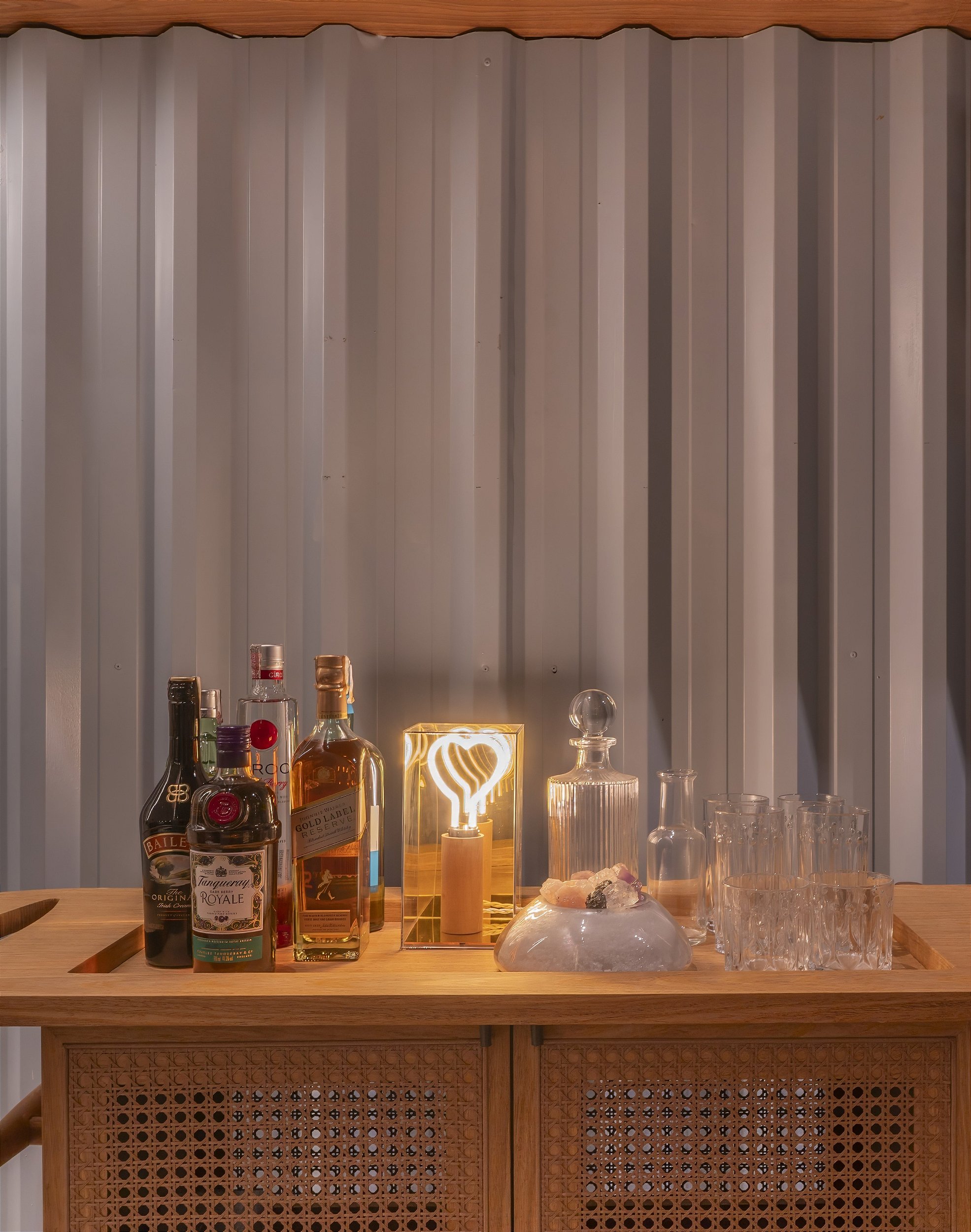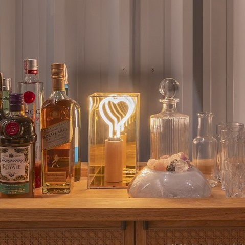 Luminária de mesa com lâmpada em formato de coração em filamento de led, bocal em freijó, caixa de acrílico transparente espelhada e fio trançado revestido em tecido.