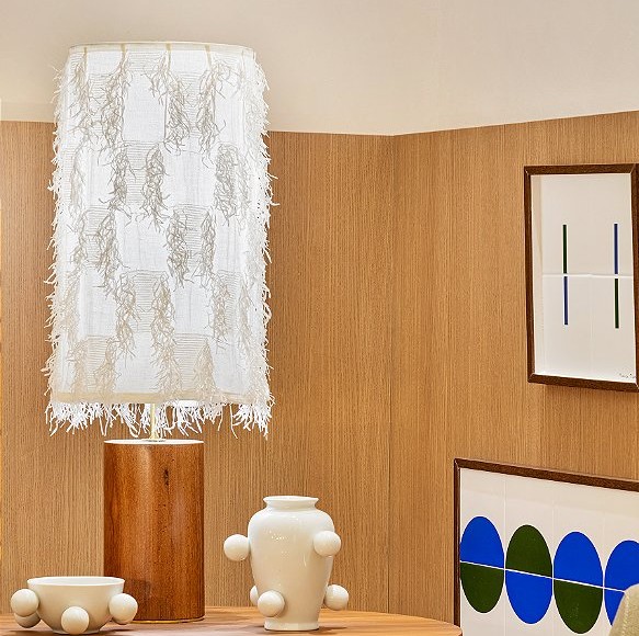 Luminária de mesa revestida com saia solta feita em gaze de linho, com aplicações de fios de papel de arroz, a base solida de madeira torneada em cumaru e acabamento de latão dourado, com lâmpada em filamento de led, bivolt. Com 1,80 de fio útil trançado na cor bege.