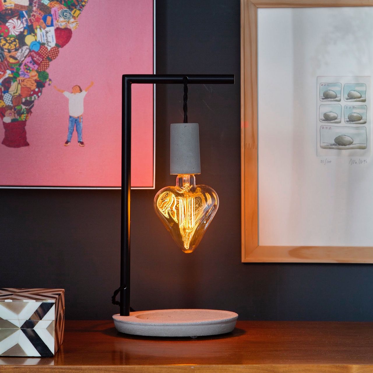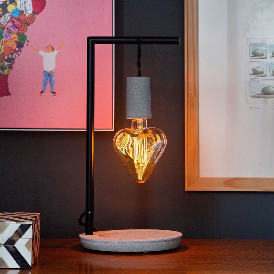 Luminária de mesa com lâmpada coração em filamento de led, bivolt, pendurada em estrutura de concreto com fio de 2 metros.