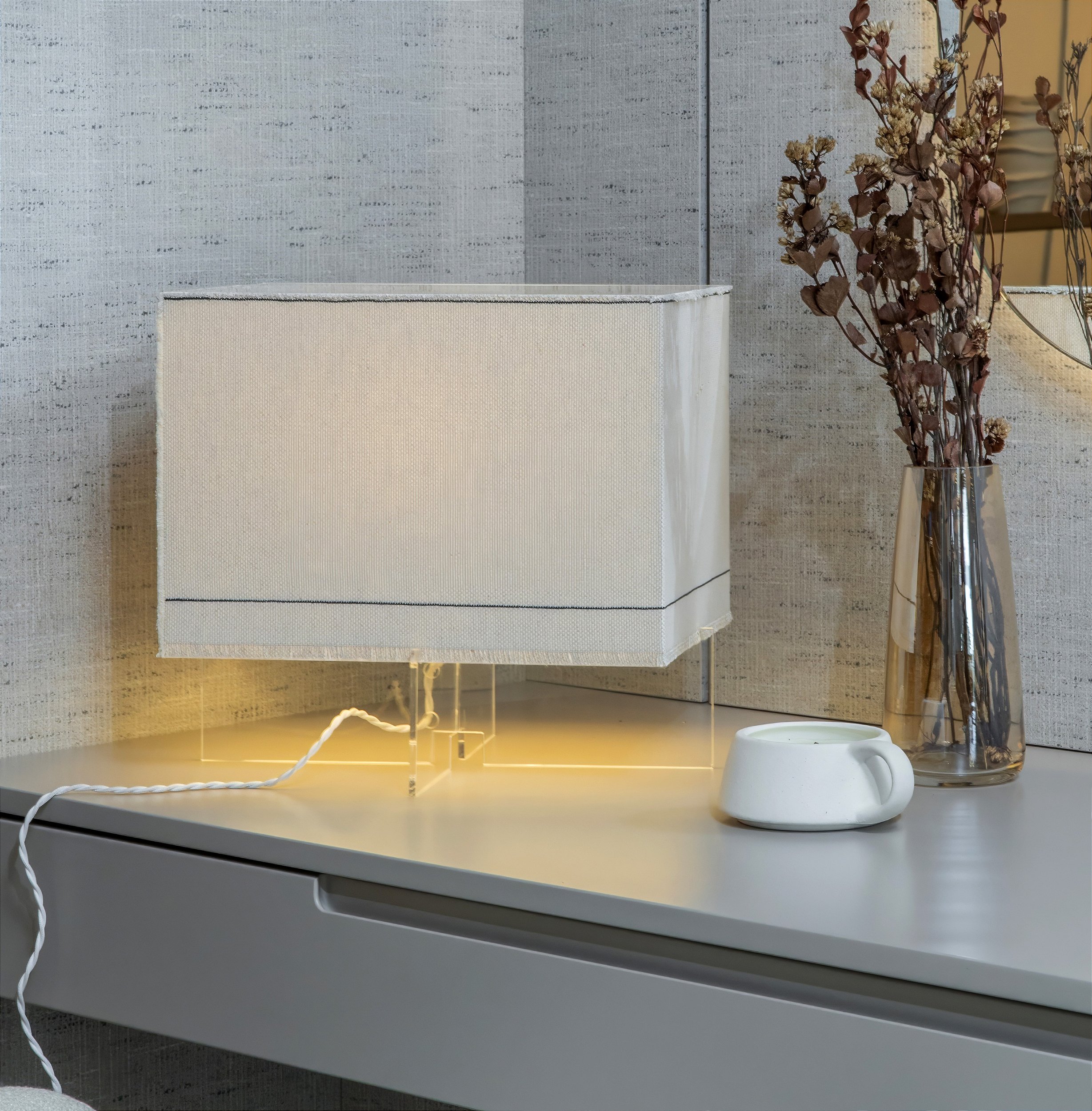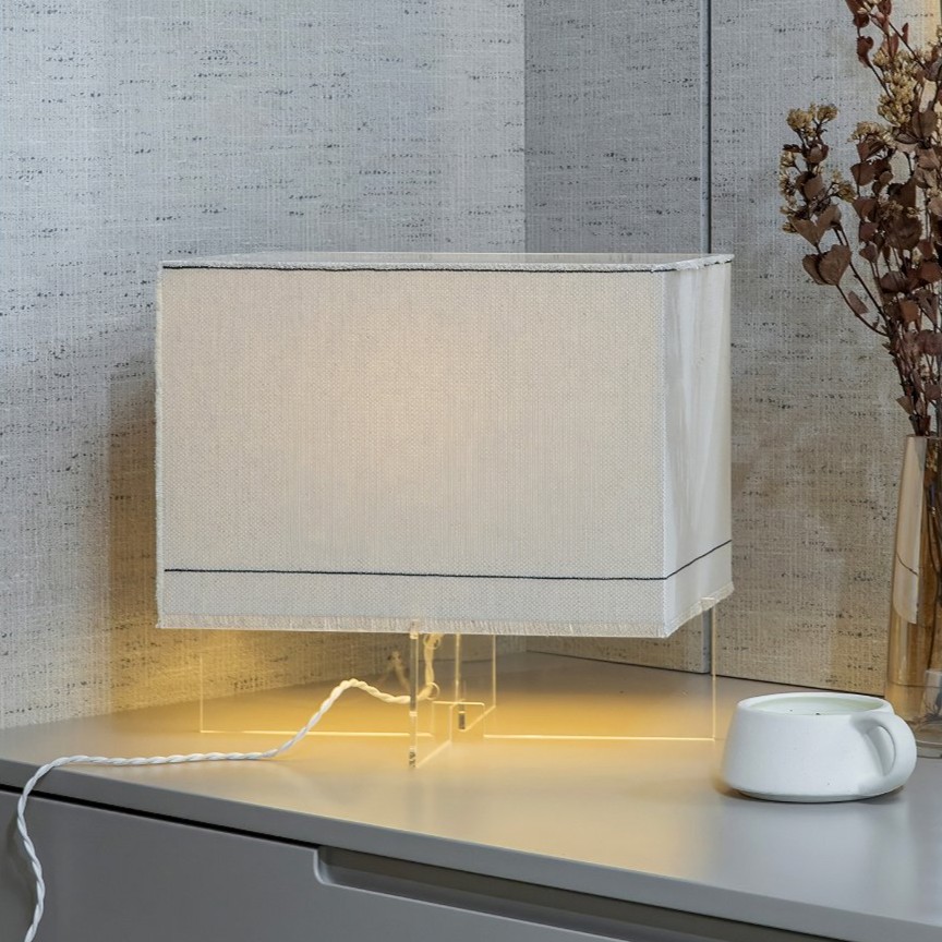 Abajour em acrílico com base transparente e cúpula opaca, branca revistida em linho