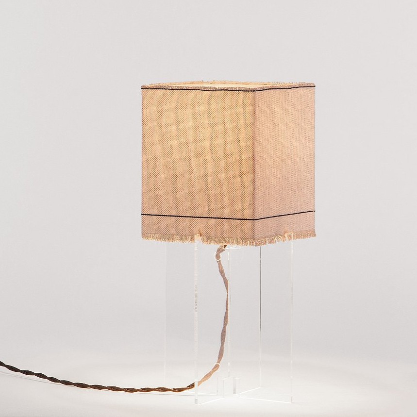 Abajour em acrílico com base transparente e cúpula opaca, branca revistida em linho