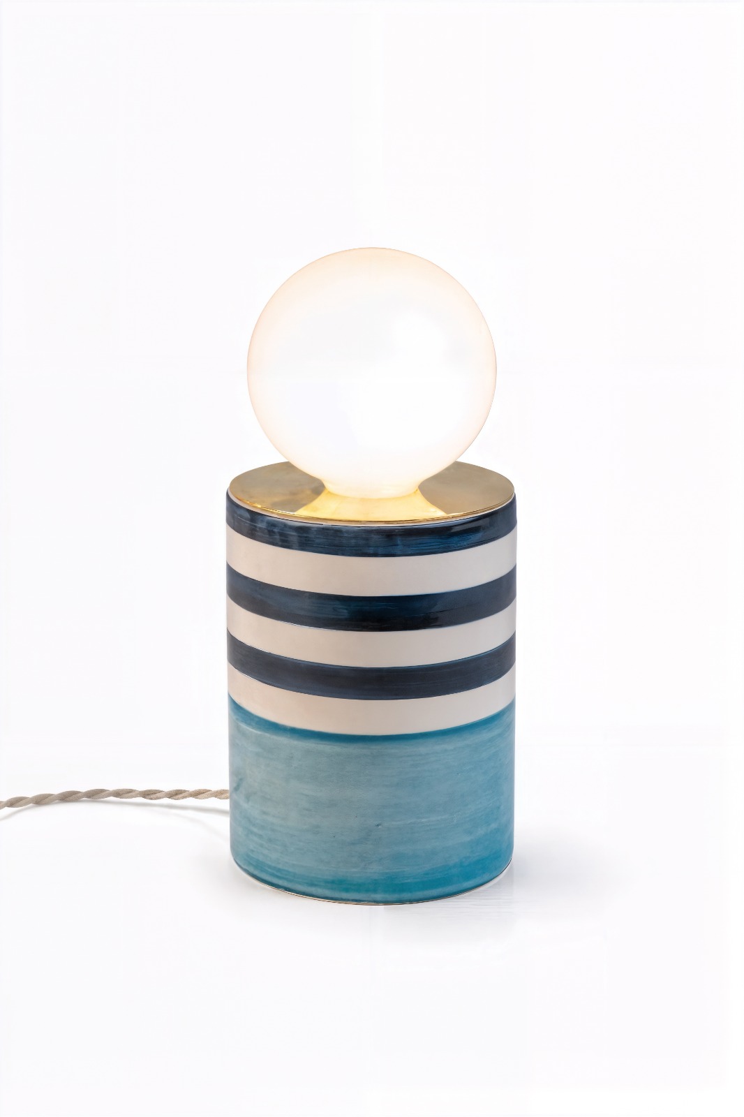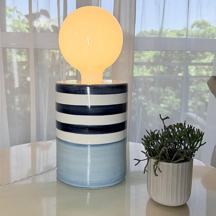 Medidas: H 32 cm | D 14 cm Fio: 180cm - Bege Lâmpada: Filamento de led Base: Em cerâmica com listras horizontais em branco e azul-marinho, finalizada com uma faixa inferior em azul claro.