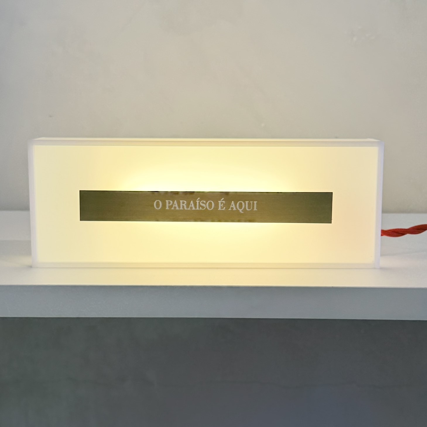 Luminária de parede ou mesa com lâmpada de led, bivolt, dentro de uma caixa de acrílico, com placa de latão com a frase escrita, fio com 1,80 metros