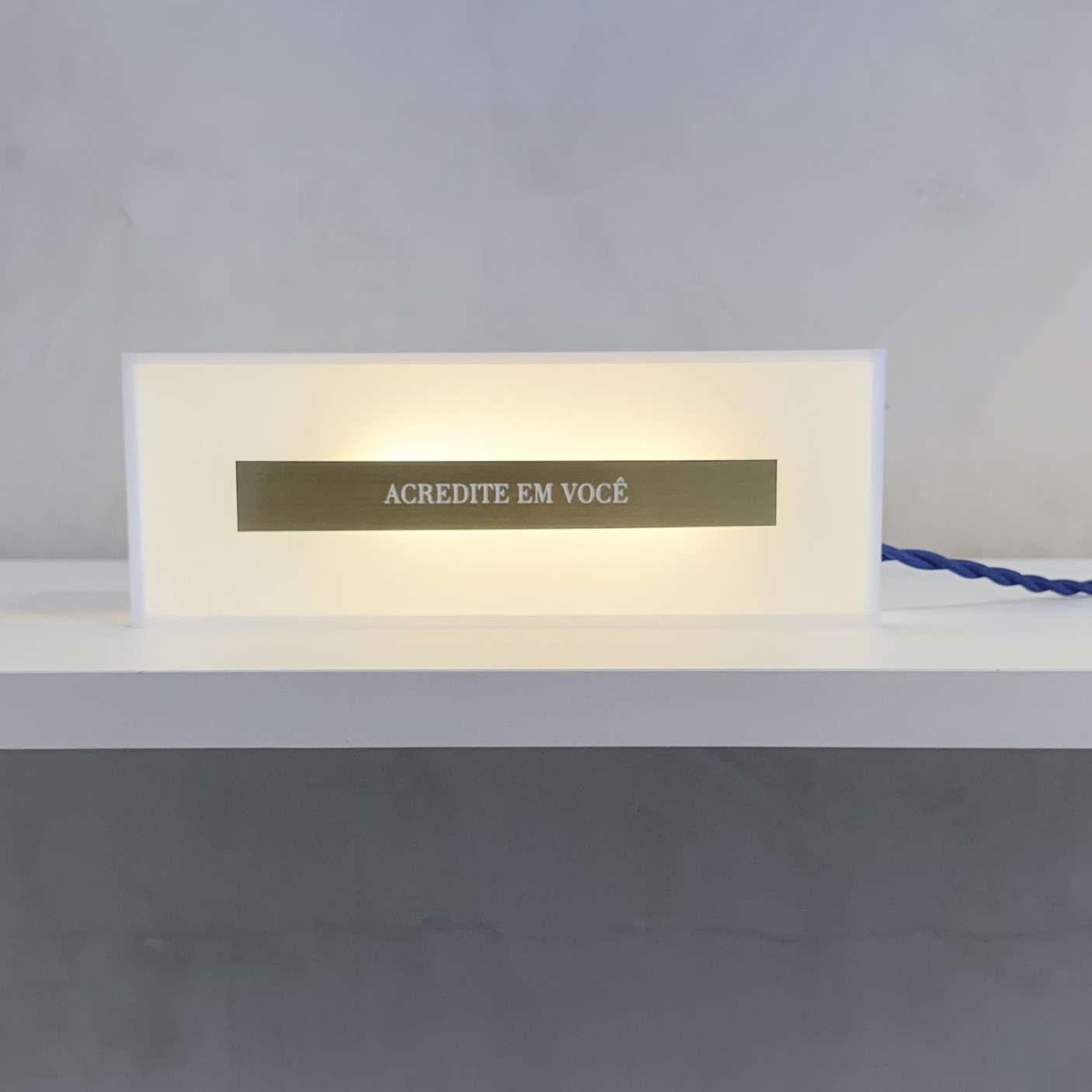 Luminária de parede ou mesa com lâmpada de led, bivolt, dentro de uma caixa de acrílico, com placa de latão com a frase escrita, fio com 1,80 metros
