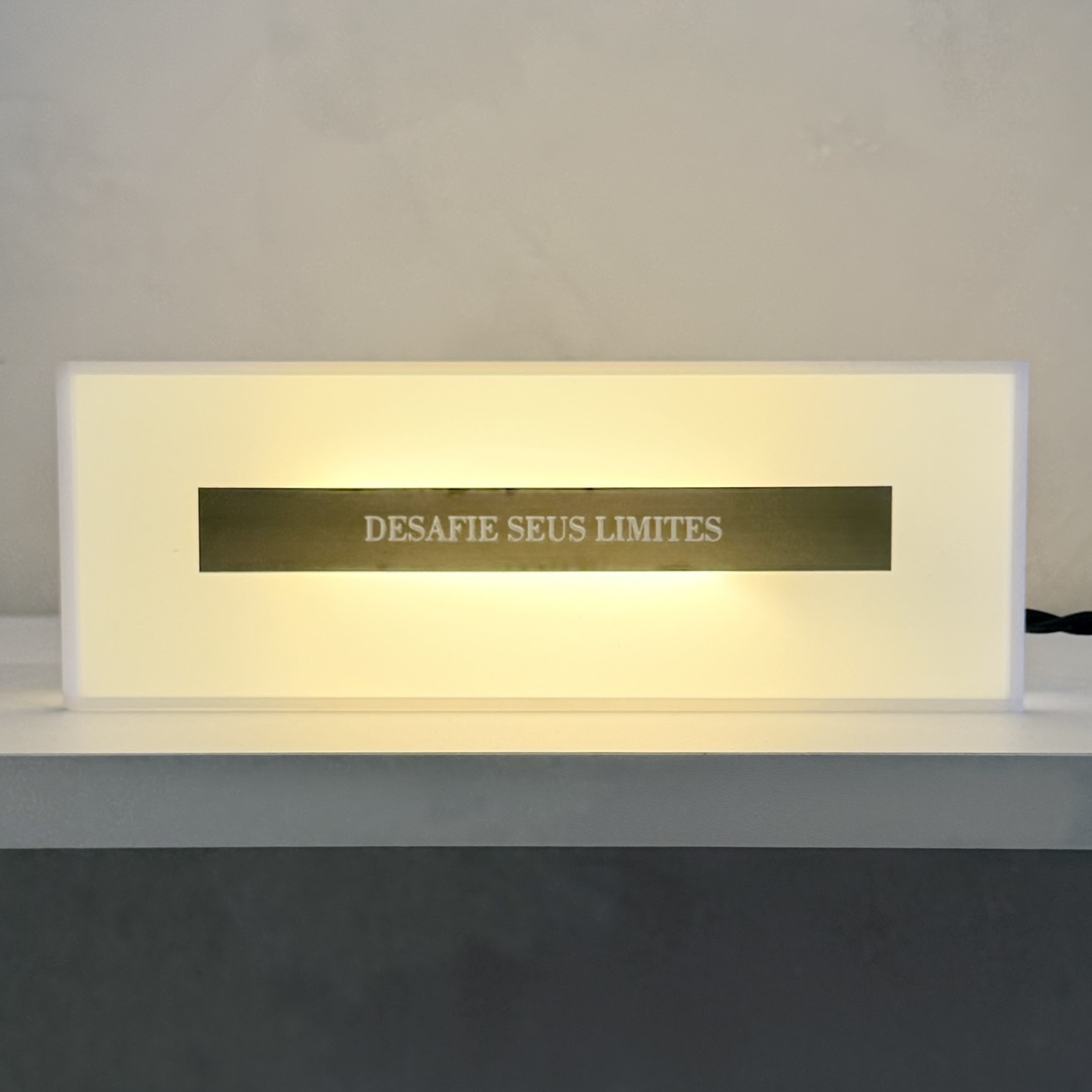 Luminária de parede ou mesa com lâmpada de led, bivolt, dentro de uma caixa de acrílico, com placa de latão com a frase escrita, fio com 1,80 metros