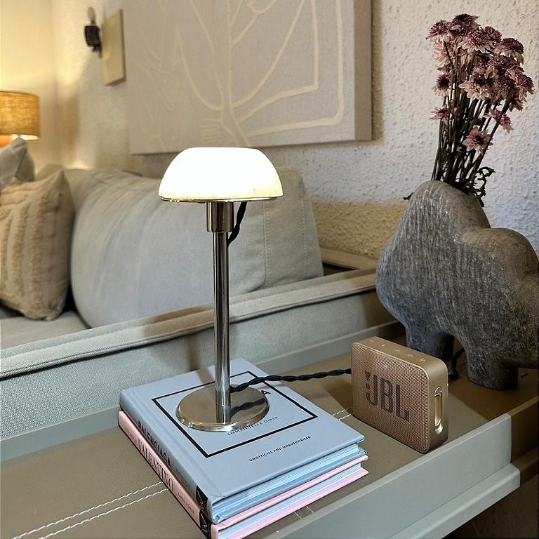 Luminaria de Mesa com lampada bipino de led, com o corpo e base de metal banhado a Latão com cupula peça da Roda Pedra Selenita, fio revestido em tecido bege com 2 metros