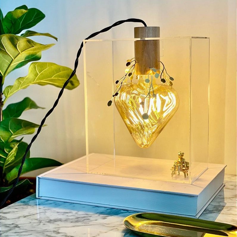 Luminária de parede ou mesa com lâmpada coração em filamento de led, bivolt, dentro de uma caixa de acrílico, bocal em madeira, fio revestido em tecido preto com 2 metros e com aplicação de peças em latão da Artista Nara Ota