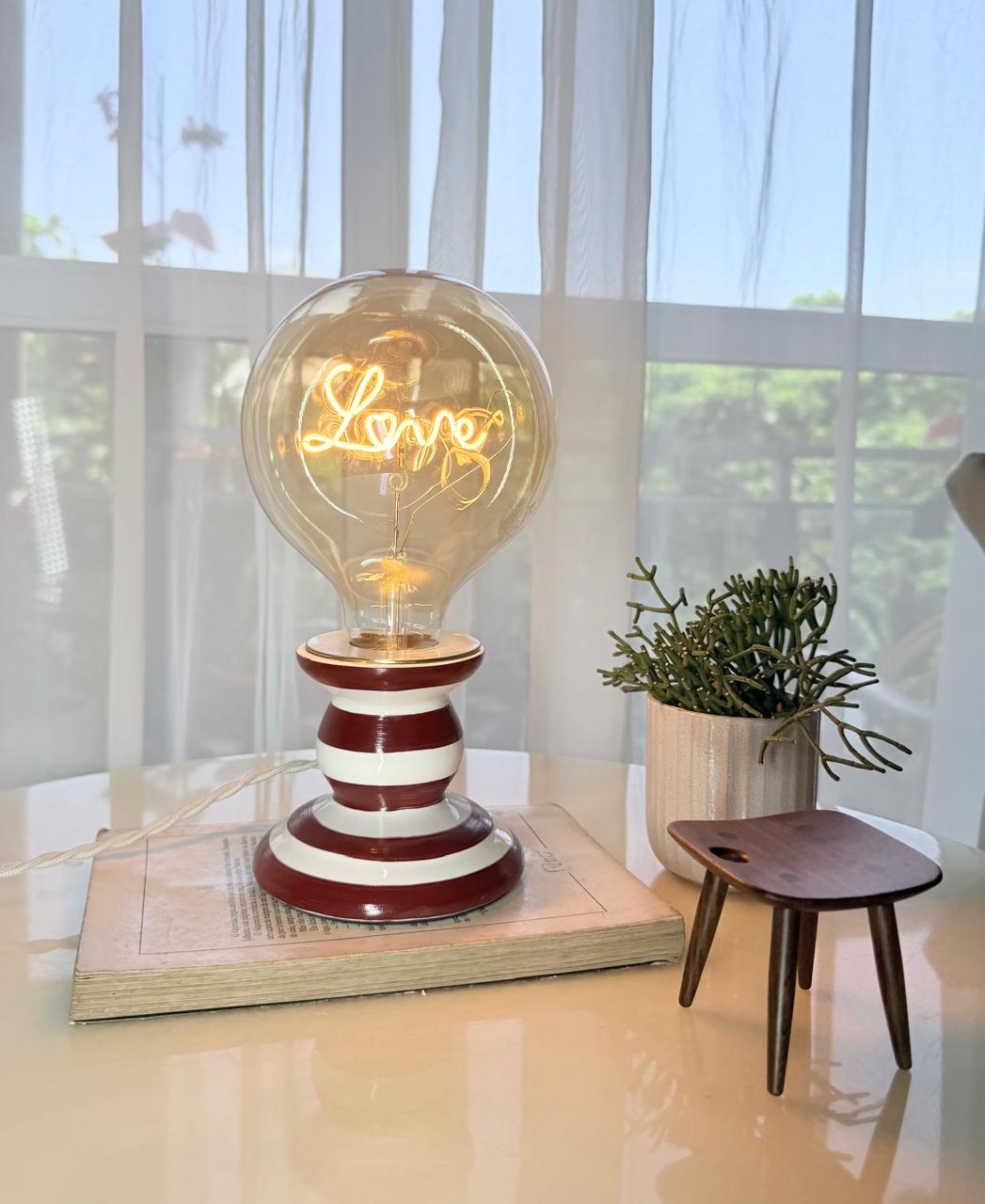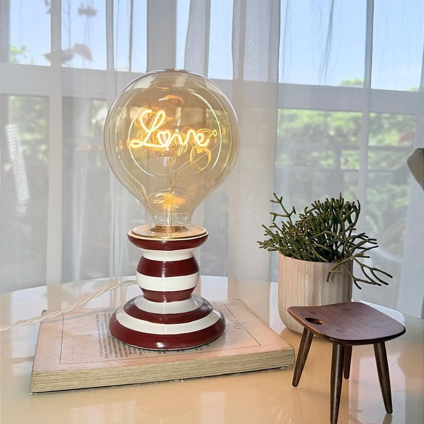 Luminária de mesa, a base em cerâmica pintada e acabamento latão, com lâmpada em filamento de led, bivolt. Com 1,80 de fio útil trançado na cor bege.