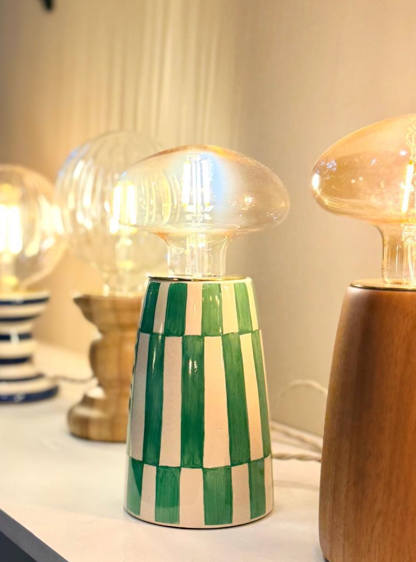 Luminária de mesa, a base em cerâmica pintada e acabamento latão, com lâmpada em filamento de led, bivolt. Com 1,80 de fio útil trançado na cor bege.