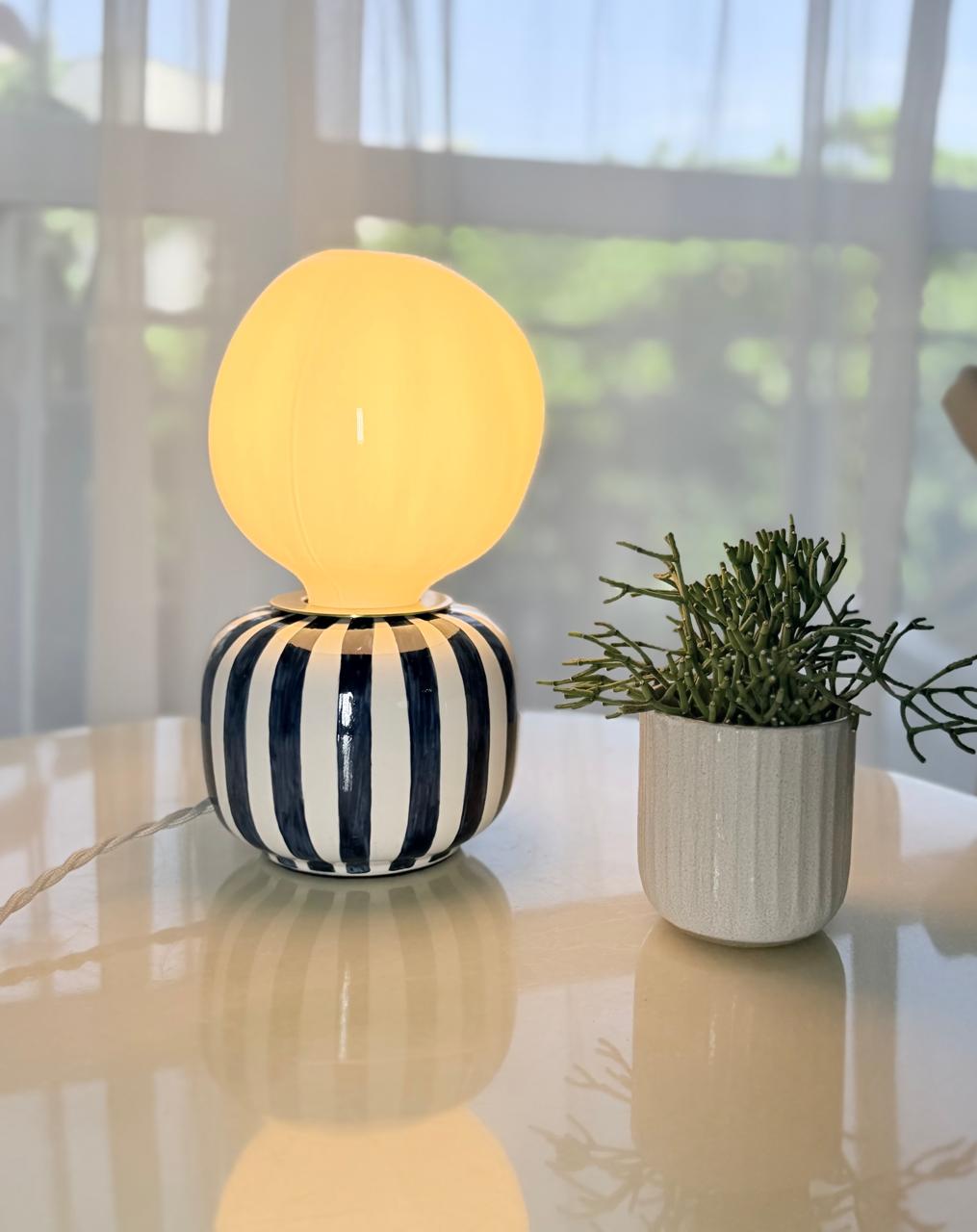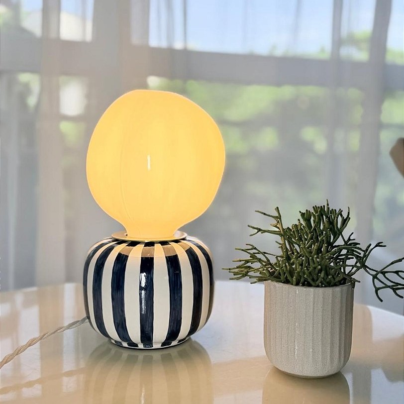 Medidas: H 23 cm | D 14 cm Fio: 180cm - Bege Lâmpada: Filamento de led Base: Em cerâmica com estampa de listras verticais nas cores branca e azul-marinho.