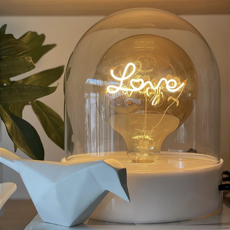 Nossa luminária traz, envolta em uma redoma de vidro, lâmpada com filamento escrito love.