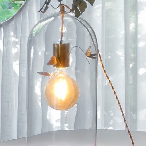 Nossa luminária traz, envolta em uma redoma de vidro, lâmpada com filamento, bocal, insetos e detalhes em latão dourado.