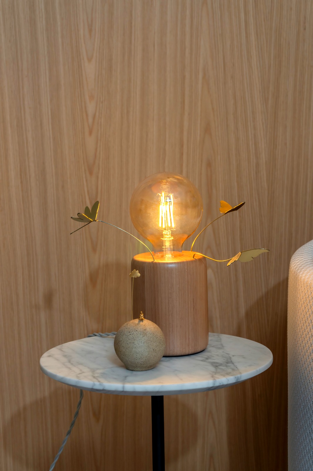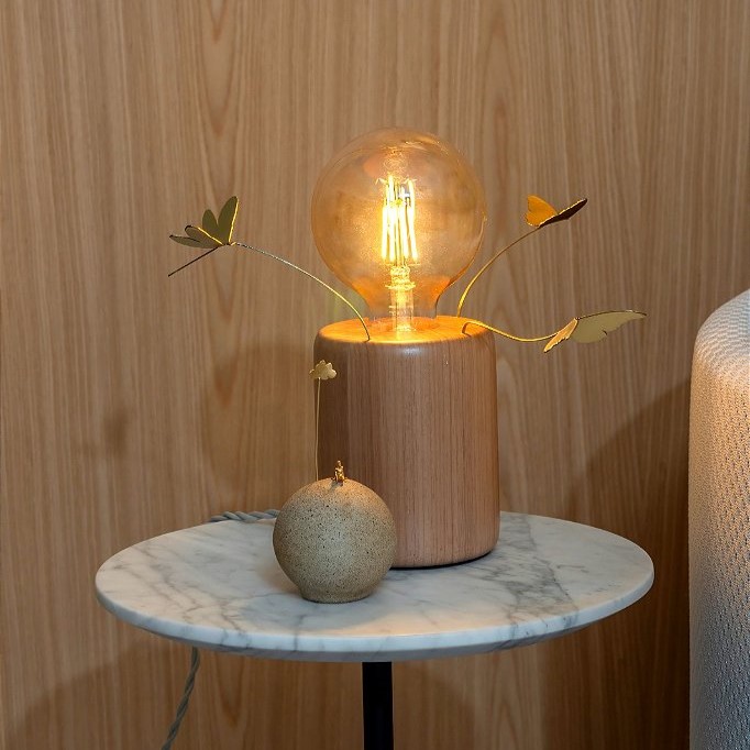 Luminaria de mesa com base em madeira, com lampada redonda de filamento de led com peças com desenho de borboleta e libelula em metal banhado a latão dourado fio revestido em tecido bege com 2 metros