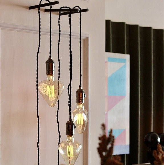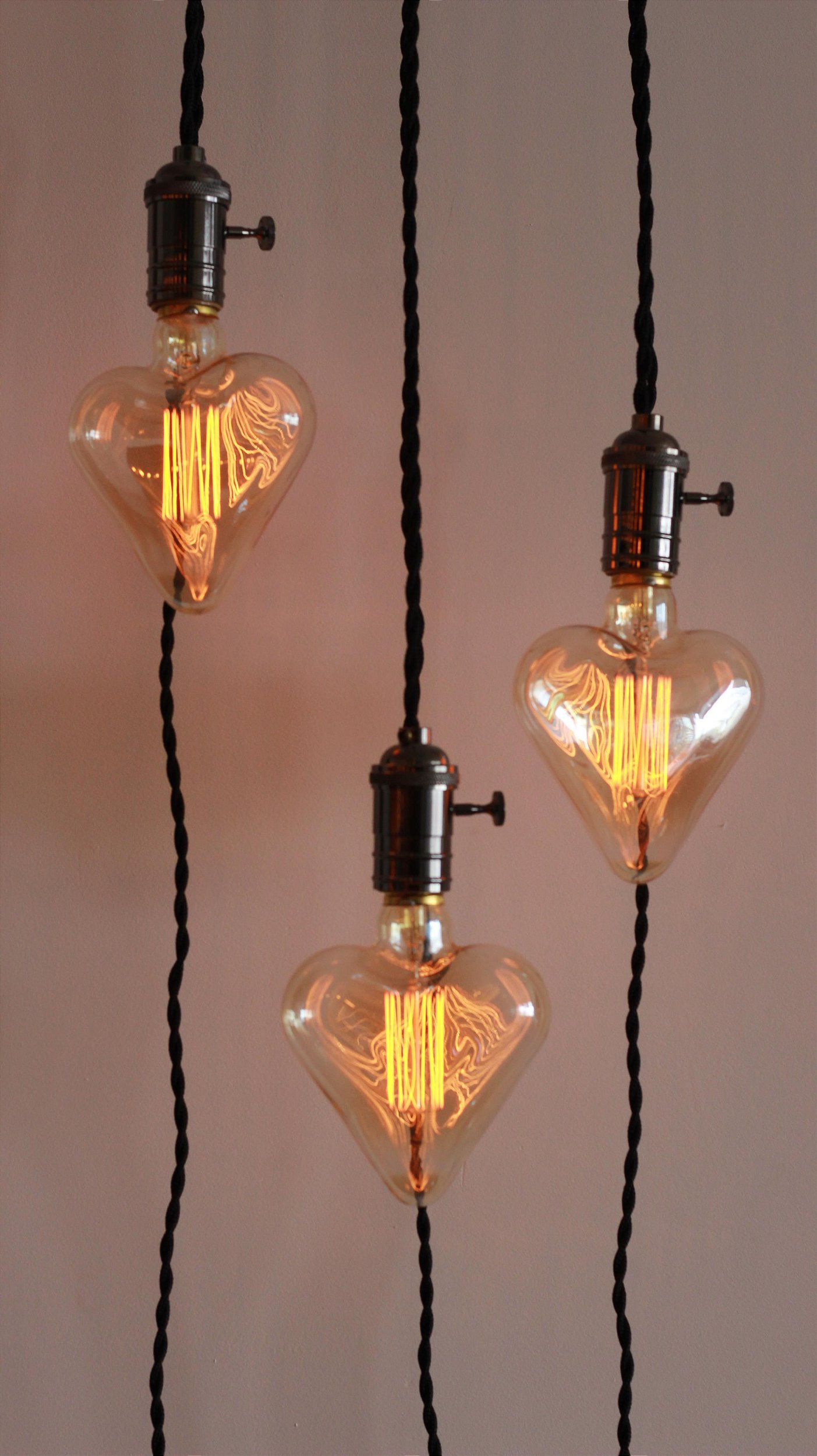 Luminária de parede com lâmpada coração e filamento de led, bivolt. Estaca em aço para fixação com 1,80 de fio útil, bocal em níquel e fio trançado em cor azul marinho.