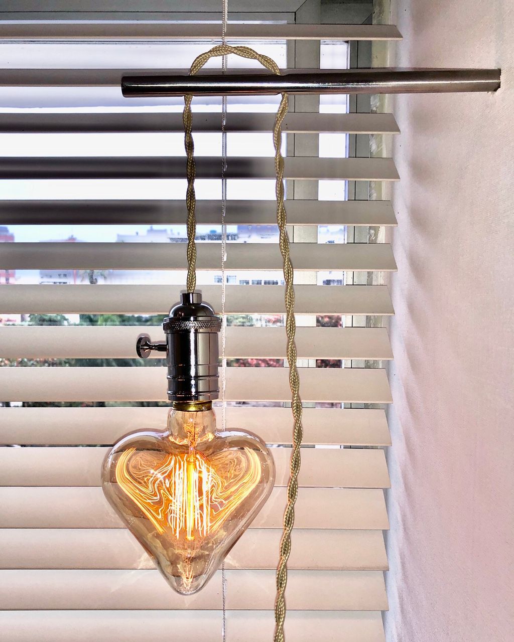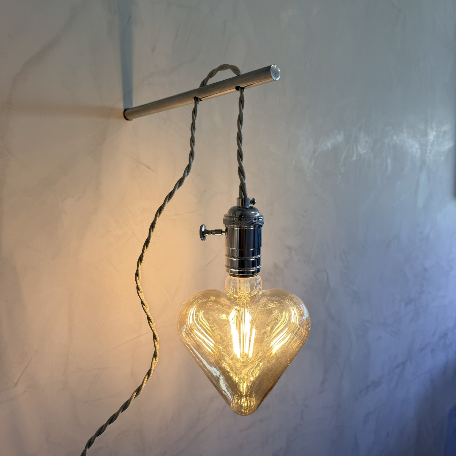Luminária de parede com lâmpada coração e filamento de led, bivolt. Estaca em aço para fixação com 1,80 de fio útil, bocal em níquel e fio trançado em cor bege.
