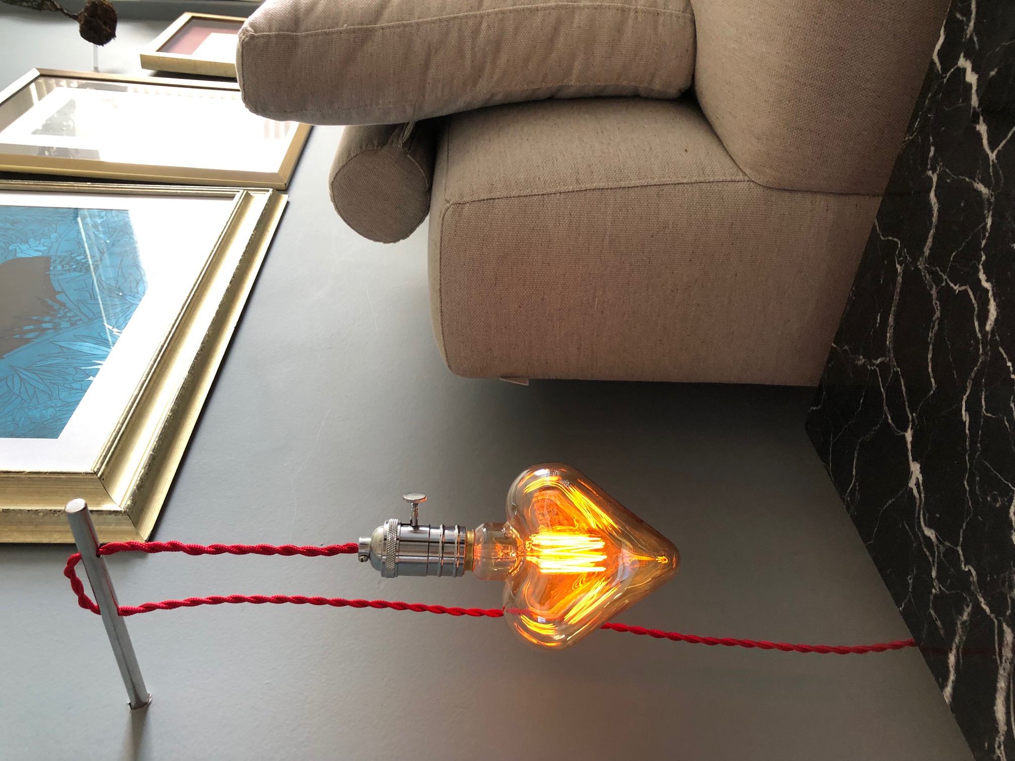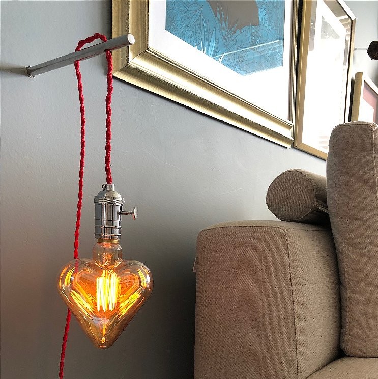 Luminária de parede com lâmpada coração e filamento de led, bivolt. Estaca em aço para fixação com 1,80 de fio útil, bocal em níquel e fio trançado em cor verrmelha.