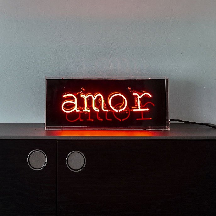 Luminária de parede ou mesa com caixa em acrílico transparente e preto, com transformador embutido na própria caixa.