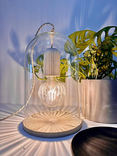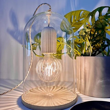 Nossa luminária traz, envolta em uma redoma de vidro, lâmpada com filamento em led, bocal e prato de cimento.