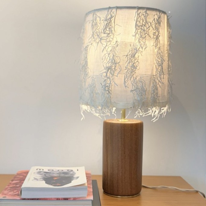Luminária de mesa revestida com saia solta feita em gaze de linho, com aplicações de fios de papel de arroz, a base solida de madeira torneada em cumaru e acabamento de latão dourado, com lâmpada em filamento de led, bivolt. Com 1,80 de fio útil trançado na cor bege.